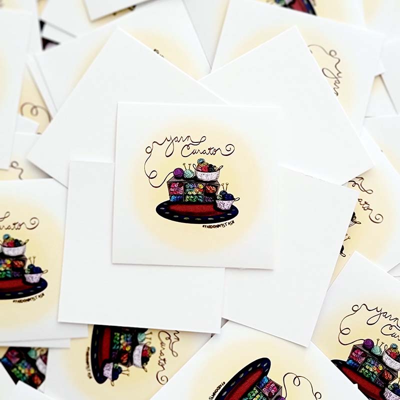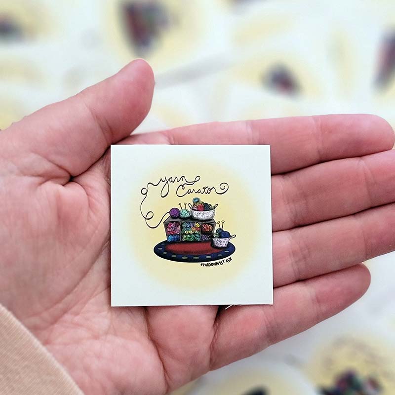 We do not stash or collect our yarn, it is a curation of fine materials. Drawn beautifully by Drea herself, this cute sticker shares the love for all things fiber.